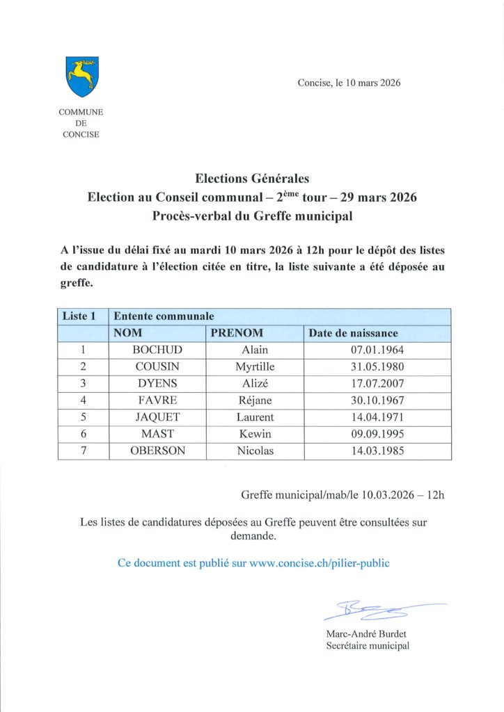 ELECTIONS GENERALES 2026 – CONSEIL COMMUNAL (2ème tour) – PV DE DEPOT DES LISTES