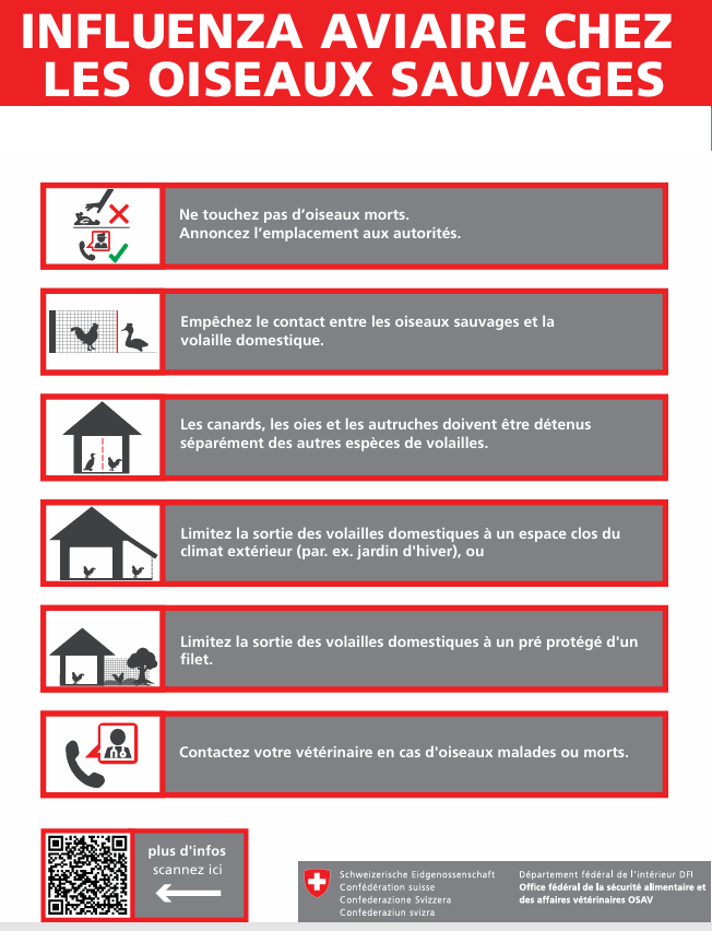 Suite à la confirmation de nouveaux cas de grippe aviaire en Suisse, l’OSAV renforce la prévention. Dès le 25 novembre 2025, l’ensemble du pays est placé en région d’observation. Les mesures sont identiques à celles déjà en vigueur dans les communes riveraines du Léman, du lac de Neuchâtel et du lac de Morat.